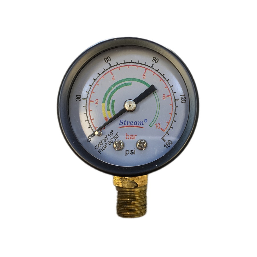 گیج فشار پمپ آب (مانومتر) مدل stream با قطر صفحه ی 5 سانتی متر و فشار کاری 10 بار و اتصال برنجی 1/4 اینچ می باشد .